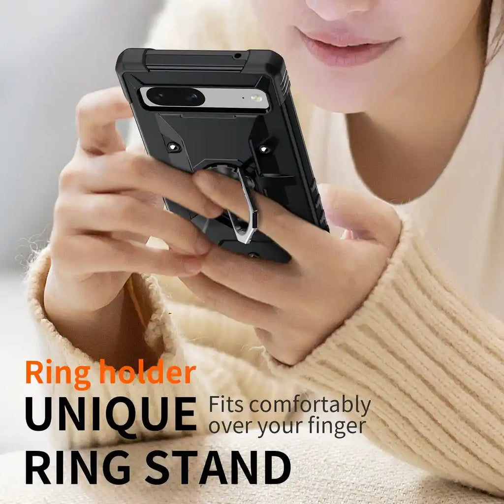 - Portable Phone Holder - Our Google Pixel 7 5G case has a metal ring-shaped phone holder, which is durable and not easy to loose. It can also be rotated 360 degrees and flipped 180 degrees, providing you with a comfortable video viewing angle. In addition, when you need to take a selfie or When holding something in your hand, you only need to pass a finger through the holder to prevent the phone from falling.