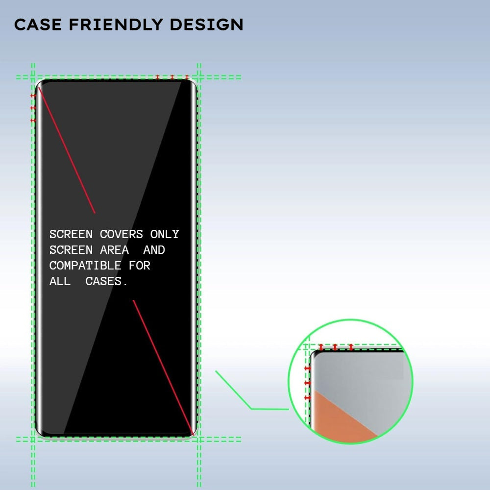 - CASE FRIENDLY - Due to the curved edge design of phone, to ensure the UV tempered glass to be compatible with all the phone cases, enough space is left at edges, providing a maximum protection for your phone screen including the curved edge.